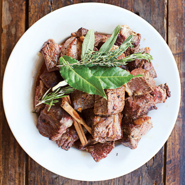 1. Sear the meat without crowding the pan. The most annoying part of making beef stew isn't chopping ingredients or waiting for the pot to finish cooking--it's waiting for all that beef to finish searing. But searing the meat chunks evenly , on all sides, until they turn a rich, reddish brown is key for building up flavor in the sauce. And in order to do that right, you can't rush it. Searing the meat in three batches (as in the recipe below) ensures that the beef pieces have enough room to brown rather than just steaming.